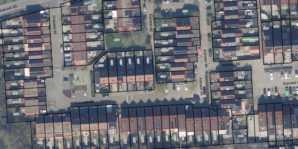 Het perceel waarop Karveel 45 49 staat heeft een oppervlakte van 164 m². Dit is een middelgroot perceel. De perceeloppervlakte wordt geregistreerd door het Kadaster. Gedetailleerde informatie over de maten van dit perceel kunt u vinden in het rapport Kadastrale kaart met maatvoering van Karveel 45 49.