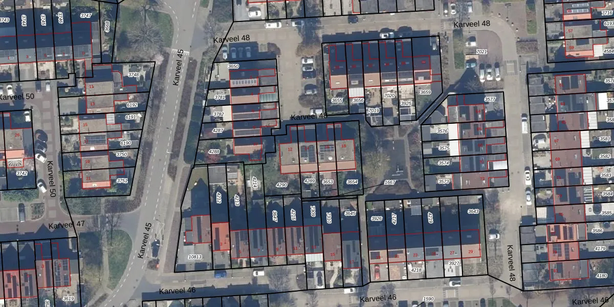 Het perceel waarop Karveel 48 14 staat heeft een oppervlakte van 145 m². Dit is een middelgroot perceel. De perceeloppervlakte wordt geregistreerd door het Kadaster. Gedetailleerde informatie over de maten van dit perceel kunt u vinden in het rapport Kadastrale kaart met maatvoering van Karveel 48 14.