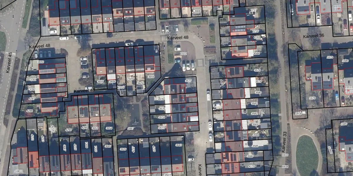 Het perceel waarop Karveel 48 64 staat heeft een oppervlakte van 209 m². Dit is een middelgroot perceel. De perceeloppervlakte wordt geregistreerd door het Kadaster. Gedetailleerde informatie over de maten van dit perceel kunt u vinden in het rapport Kadastrale kaart met maatvoering van Karveel 48 64.