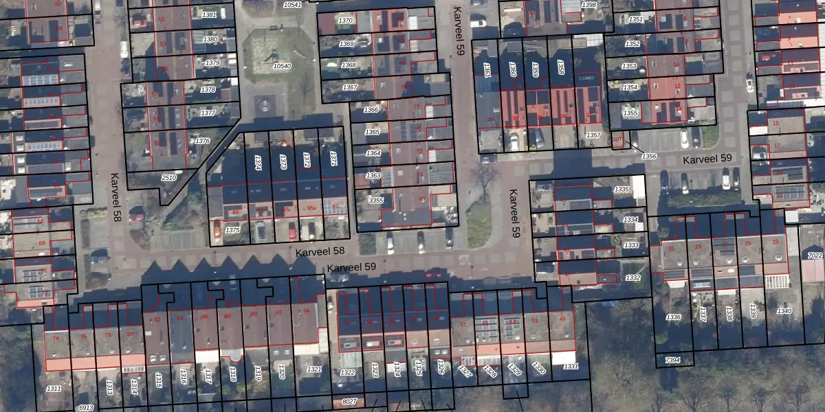 Het perceel waarop Karveel 59 69 staat heeft een oppervlakte van 256 m². Dit is een middelgroot perceel. De perceeloppervlakte wordt geregistreerd door het Kadaster. Gedetailleerde informatie over de maten van dit perceel kunt u vinden in het rapport Kadastrale kaart met maatvoering van Karveel 59 69.