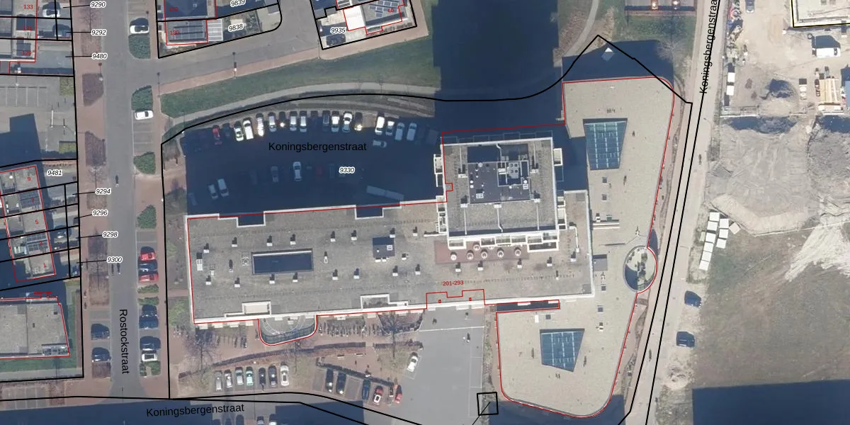 Het perceel waarop Koningsbergenstraat 201-G staat heeft een oppervlakte van 8855 m². Dit is een zeer groot perceel. De perceeloppervlakte wordt geregistreerd door het Kadaster. Gedetailleerde informatie over de maten van dit perceel kunt u vinden in het rapport Kadastrale kaart met maatvoering van Koningsbergenstraat 201-G.