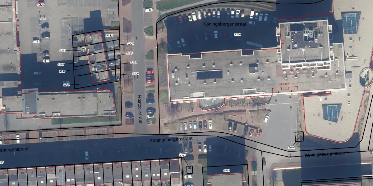 Het perceel waarop Koningsbergenstraat 201-R staat heeft een oppervlakte van 8855 m². Dit is een zeer groot perceel. De perceeloppervlakte wordt geregistreerd door het Kadaster. Gedetailleerde informatie over de maten van dit perceel kunt u vinden in het rapport Kadastrale kaart met maatvoering van Koningsbergenstraat 201-R.