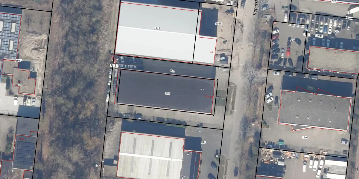 Het perceel waarop Koperstraat 12-R staat heeft een oppervlakte van 1059 m². Dit is een zeer groot perceel. De perceeloppervlakte wordt geregistreerd door het Kadaster. Gedetailleerde informatie over de maten van dit perceel kunt u vinden in het rapport Kadastrale kaart met maatvoering van Koperstraat 12-R.