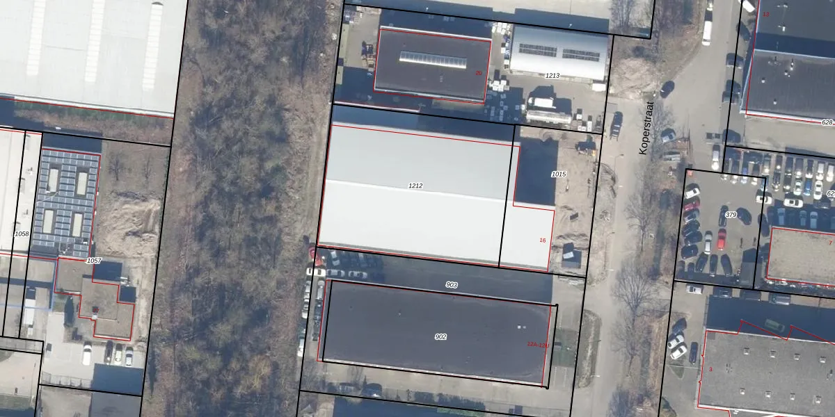 Het perceel waarop Koperstraat 16 staat heeft een oppervlakte van 1513 m². Dit is een zeer groot perceel. De perceeloppervlakte wordt geregistreerd door het Kadaster. Gedetailleerde informatie over de maten van dit perceel kunt u vinden in het rapport Kadastrale kaart met maatvoering van Koperstraat 16.