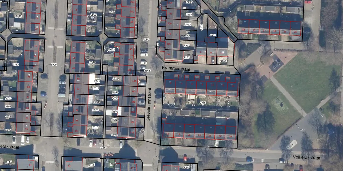 Het perceel waarop Krammerstraat 2 staat heeft een oppervlakte van 1935 m². Dit is een zeer groot perceel. De perceeloppervlakte wordt geregistreerd door het Kadaster. Gedetailleerde informatie over de maten van dit perceel kunt u vinden in het rapport Kadastrale kaart met maatvoering van Krammerstraat 2.