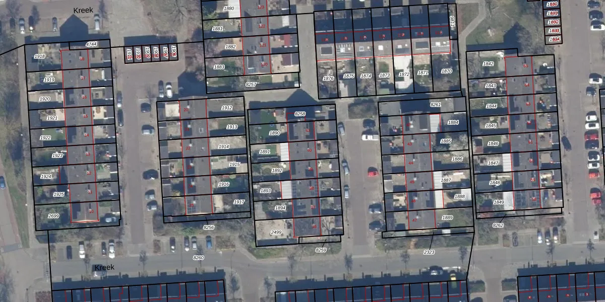 Het perceel waarop Kreek 40 staat heeft een oppervlakte van 183 m². Dit is een middelgroot perceel. De perceeloppervlakte wordt geregistreerd door het Kadaster. Gedetailleerde informatie over de maten van dit perceel kunt u vinden in het rapport Kadastrale kaart met maatvoering van Kreek 40.