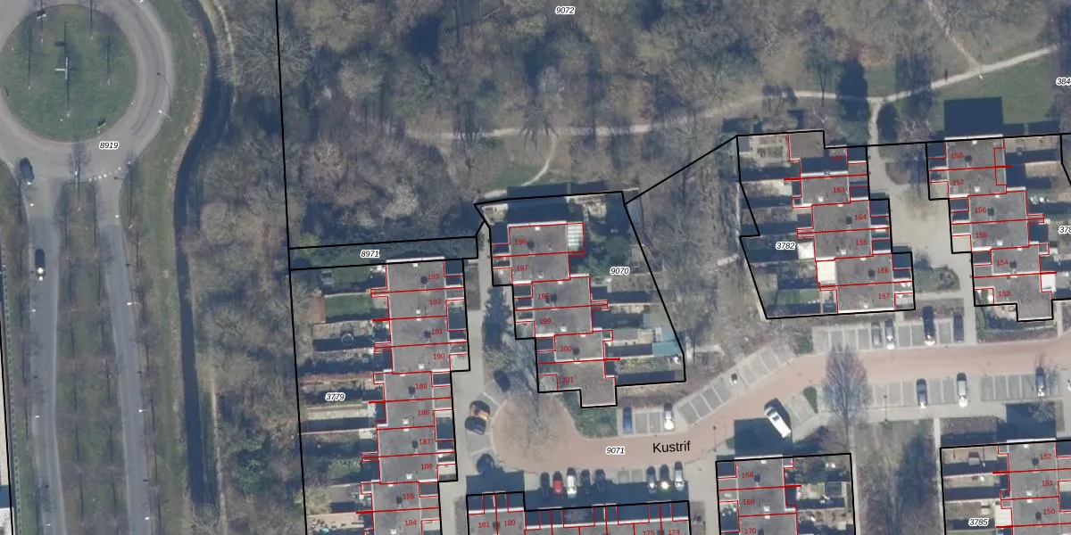 Kustrif 197 is gelegen op kadastraal perceel LLS00K9070. Deze kadastrale aanduiding is uniek en wordt gebruikt door het Kadaster om eigendomsrechten en andere zakelijke rechten vast te leggen. Het perceel maakt onderdeel uit van de kadastrale gemeente Lelystad.