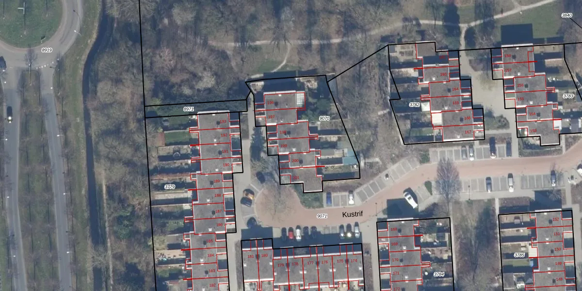 Kustrif 199 is gelegen op kadastraal perceel LLS00K9070. Deze kadastrale aanduiding is uniek en wordt gebruikt door het Kadaster om eigendomsrechten en andere zakelijke rechten vast te leggen. Het perceel maakt onderdeel uit van de kadastrale gemeente Lelystad.
