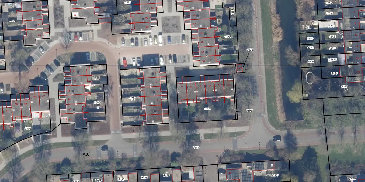 Het adres is gelegen op perceel 3799 in de sectie K en de kadastrale gemeente Lelystad. De kadastrale aanduiding is aldus LLS00-K-3799. Het perceel is kleiner dan gemiddeld in Lelystad. Het perceel is 778 m² groot, terwijl het gemiddelde ligt op 2,1 ha. Het grootste perceel in de kadastrale gemeente is 78,50 km². Het kleinste perceel heeft een oppervlakte van 0 m². Er zijn 6 adressen aanwezig op het perceel. De huidige grenzen van het perceel zijn digitaal in de Basisregistratie Kadaster (BRK) geregistreerd op 18-02-2008.