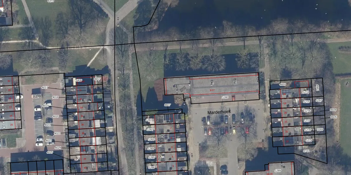 Marderhoek 14 is gelegen op kadastraal perceel LLS00K1280. Deze kadastrale aanduiding is uniek en wordt gebruikt door het Kadaster om eigendomsrechten en andere zakelijke rechten vast te leggen. Het perceel maakt onderdeel uit van de kadastrale gemeente Lelystad.
