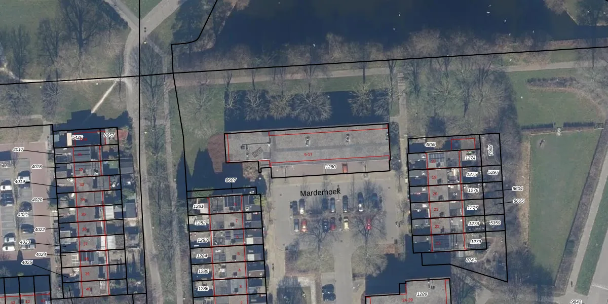 Marderhoek 9-C is gelegen op kadastraal perceel LLS00K1280. Deze kadastrale aanduiding is uniek en wordt gebruikt door het Kadaster om eigendomsrechten en andere zakelijke rechten vast te leggen. Het perceel maakt onderdeel uit van de kadastrale gemeente Lelystad.