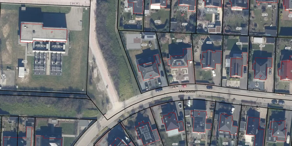 Het perceel waarop Marquette 30 staat heeft een oppervlakte van 924 m². Dit is een groot perceel. De perceeloppervlakte wordt geregistreerd door het Kadaster. Gedetailleerde informatie over de maten van dit perceel kunt u vinden in het rapport Kadastrale kaart met maatvoering van Marquette 30.