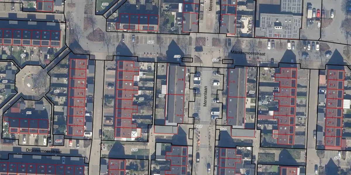 Merenlaan 32 is gelegen op kadastraal perceel LLS00P990. Deze kadastrale aanduiding is uniek en wordt gebruikt door het Kadaster om eigendomsrechten en andere zakelijke rechten vast te leggen. Het perceel maakt onderdeel uit van de kadastrale gemeente Lelystad.