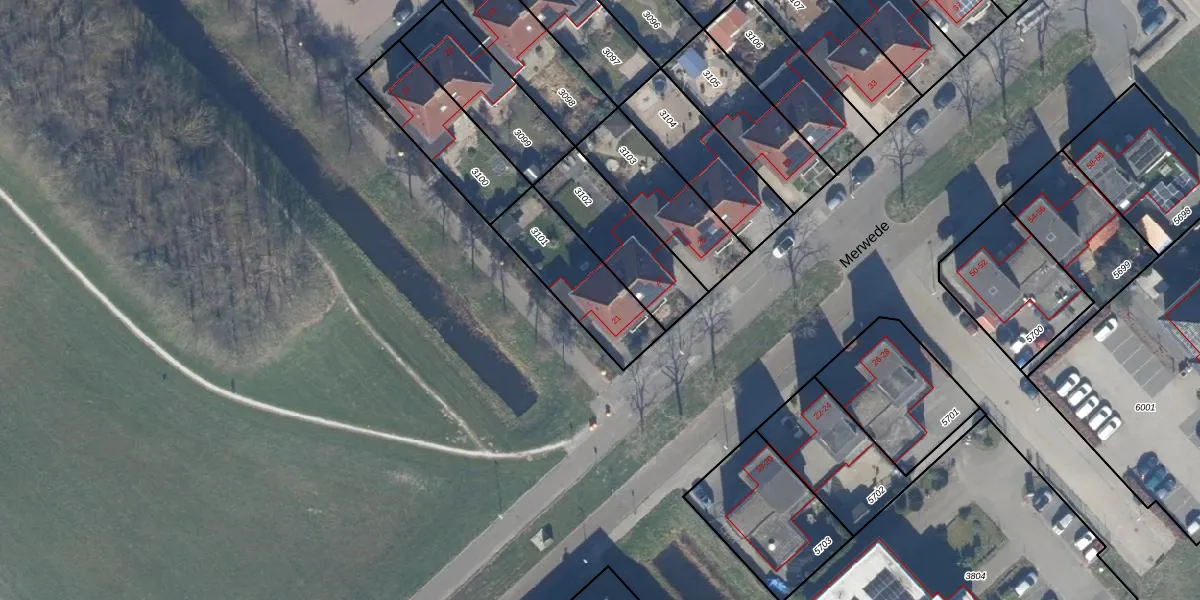 Het perceel waarop Merwede 21 staat heeft een oppervlakte van 318 m². Dit is een groot perceel. De perceeloppervlakte wordt geregistreerd door het Kadaster. Gedetailleerde informatie over de maten van dit perceel kunt u vinden in het rapport Kadastrale kaart met maatvoering van Merwede 21.