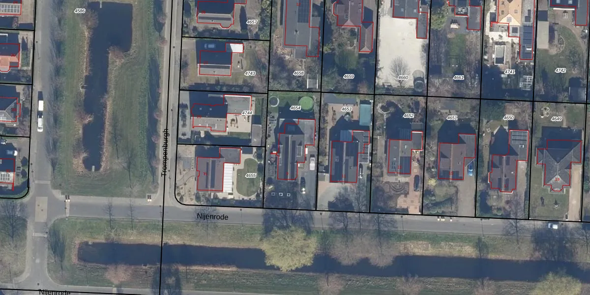 Nijenrode 9 is gelegen op kadastraal perceel LLS00P4654. Deze kadastrale aanduiding is uniek en wordt gebruikt door het Kadaster om eigendomsrechten en andere zakelijke rechten vast te leggen. Het perceel maakt onderdeel uit van de kadastrale gemeente Lelystad.