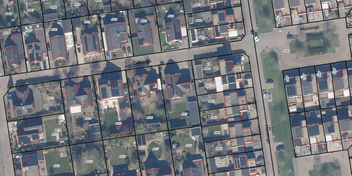 Het perceel waarop Oostergo 54 staat heeft een oppervlakte van 709 m². Dit is een groot perceel. De perceeloppervlakte wordt geregistreerd door het Kadaster. Gedetailleerde informatie over de maten van dit perceel kunt u vinden in het rapport Kadastrale kaart met maatvoering van Oostergo 54.