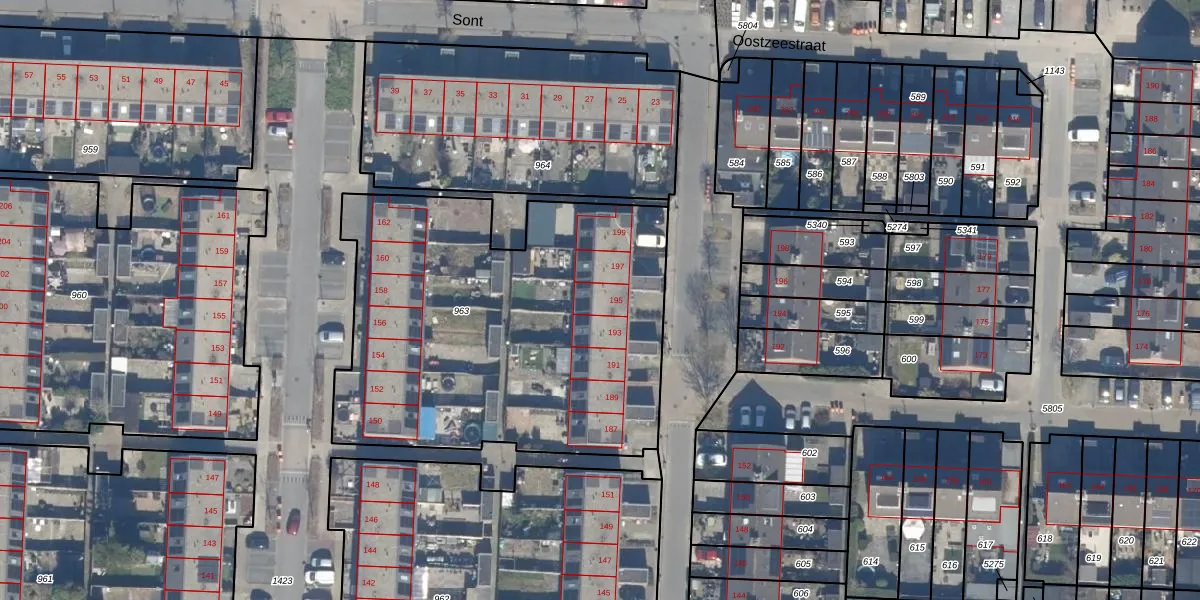 Het perceel waarop Oostzeestraat 195 staat heeft een oppervlakte van 2149 m². Dit is een zeer groot perceel. De perceeloppervlakte wordt geregistreerd door het Kadaster. Gedetailleerde informatie over de maten van dit perceel kunt u vinden in het rapport Kadastrale kaart met maatvoering van Oostzeestraat 195.
