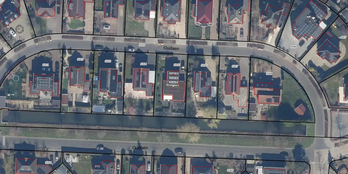 Het perceel waarop Oudaen 30 staat heeft een oppervlakte van 657 m². Dit is een groot perceel. De perceeloppervlakte wordt geregistreerd door het Kadaster. Gedetailleerde informatie over de maten van dit perceel kunt u vinden in het rapport Kadastrale kaart met maatvoering van Oudaen 30.