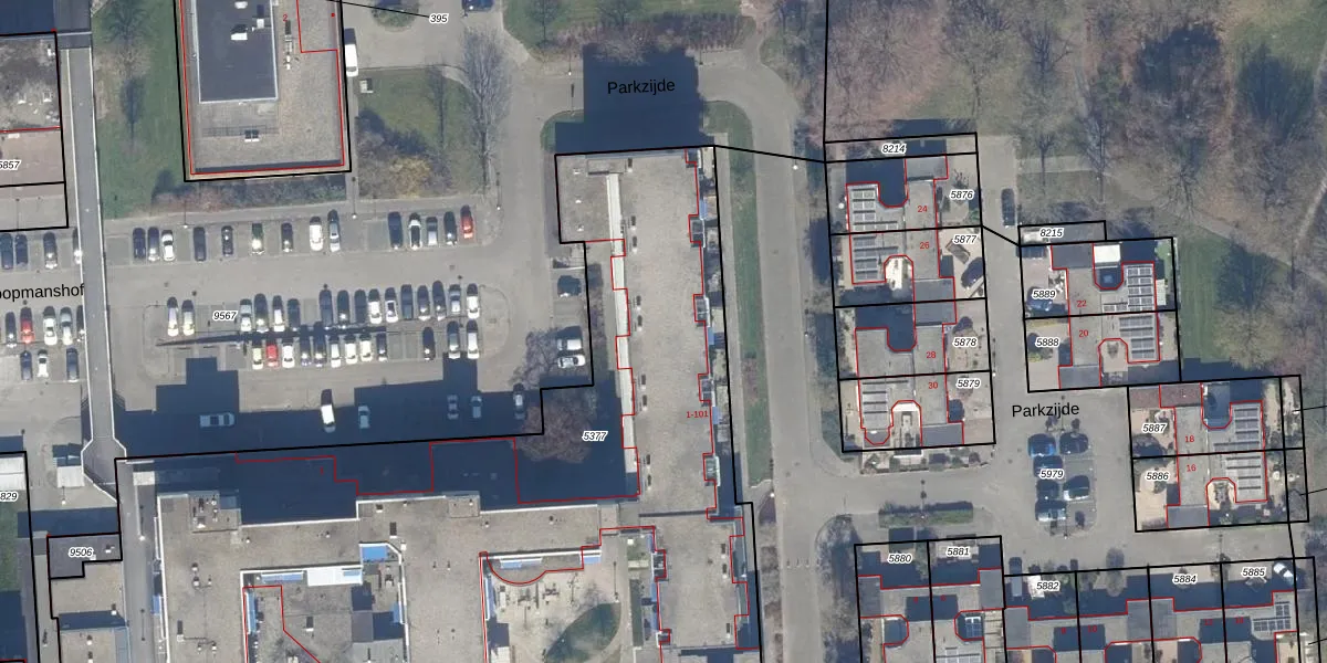 Het perceel waarop Parkzijde 39 staat heeft een oppervlakte van 5876 m². Dit is een zeer groot perceel. De perceeloppervlakte wordt geregistreerd door het Kadaster. Gedetailleerde informatie over de maten van dit perceel kunt u vinden in het rapport Kadastrale kaart met maatvoering van Parkzijde 39.