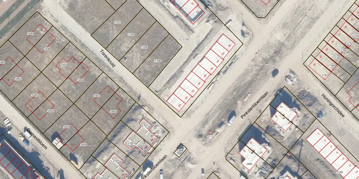 Pinksterbloemlaan 54 is gelegen op kadastraal perceel LLS00A1733. Deze kadastrale aanduiding is uniek en wordt gebruikt door het Kadaster om eigendomsrechten en andere zakelijke rechten vast te leggen. Het perceel maakt onderdeel uit van de kadastrale gemeente Lelystad.