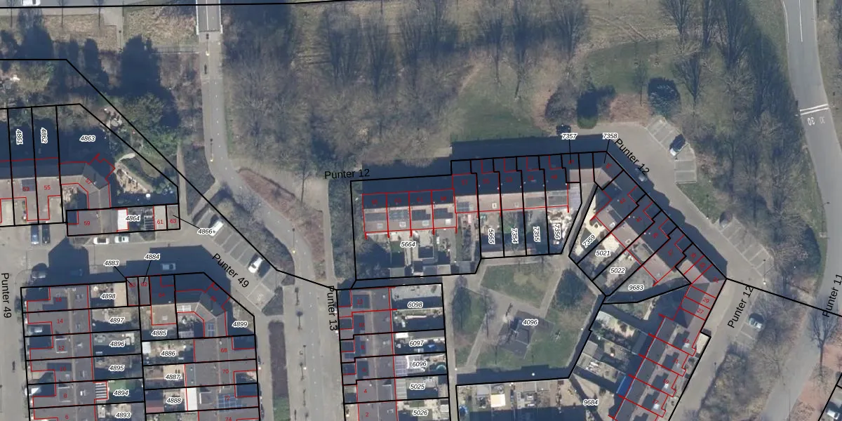 Het perceel waarop Punter 12 61 staat heeft een oppervlakte van 721 m². Dit is een groot perceel. De perceeloppervlakte wordt geregistreerd door het Kadaster. Gedetailleerde informatie over de maten van dit perceel kunt u vinden in het rapport Kadastrale kaart met maatvoering van Punter 12 61.