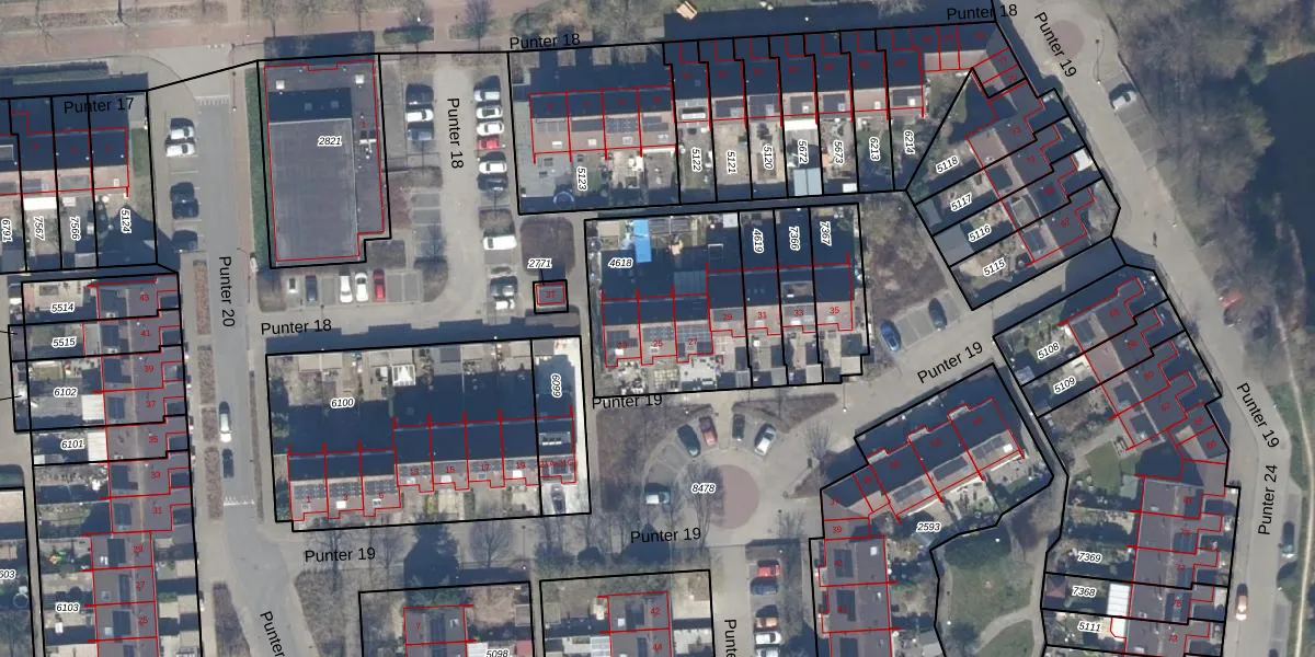 Het perceel waarop Punter 19 25 staat heeft een oppervlakte van 640 m². Dit is een groot perceel. De perceeloppervlakte wordt geregistreerd door het Kadaster. Gedetailleerde informatie over de maten van dit perceel kunt u vinden in het rapport Kadastrale kaart met maatvoering van Punter 19 25.