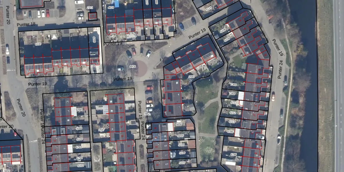 Het perceel waarop Punter 19 41 staat heeft een oppervlakte van 988 m². Dit is een groot perceel. De perceeloppervlakte wordt geregistreerd door het Kadaster. Gedetailleerde informatie over de maten van dit perceel kunt u vinden in het rapport Kadastrale kaart met maatvoering van Punter 19 41.