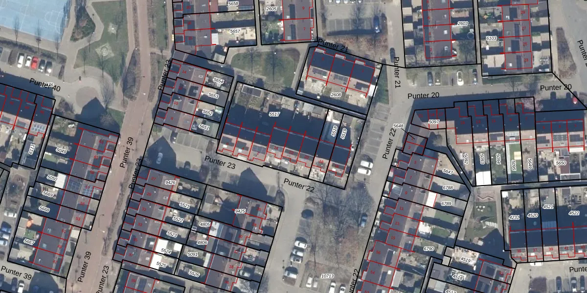 Het perceel waarop Punter 22 22 staat heeft een oppervlakte van 821 m². Dit is een groot perceel. De perceeloppervlakte wordt geregistreerd door het Kadaster. Gedetailleerde informatie over de maten van dit perceel kunt u vinden in het rapport Kadastrale kaart met maatvoering van Punter 22 22.