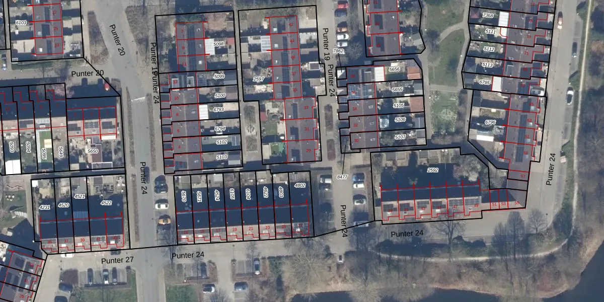 Het perceel waarop Punter 24 29 staat heeft een oppervlakte van 1208 m². Dit is een zeer groot perceel. De perceeloppervlakte wordt geregistreerd door het Kadaster. Gedetailleerde informatie over de maten van dit perceel kunt u vinden in het rapport Kadastrale kaart met maatvoering van Punter 24 29.