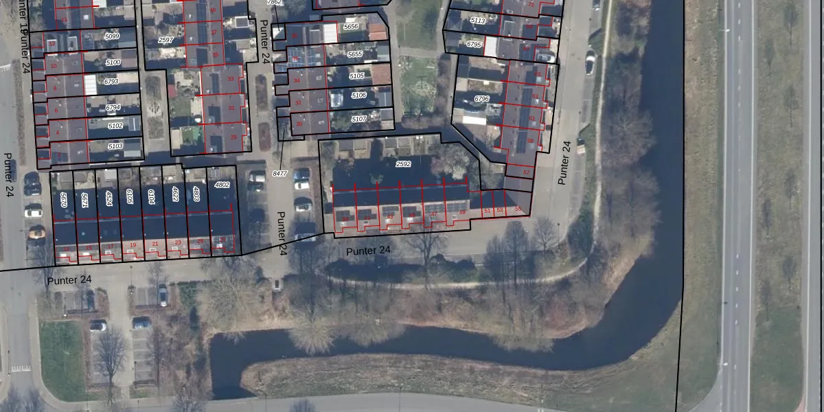 Het perceel waarop Punter 24 45 staat heeft een oppervlakte van 959 m². Dit is een groot perceel. De perceeloppervlakte wordt geregistreerd door het Kadaster. Gedetailleerde informatie over de maten van dit perceel kunt u vinden in het rapport Kadastrale kaart met maatvoering van Punter 24 45.
