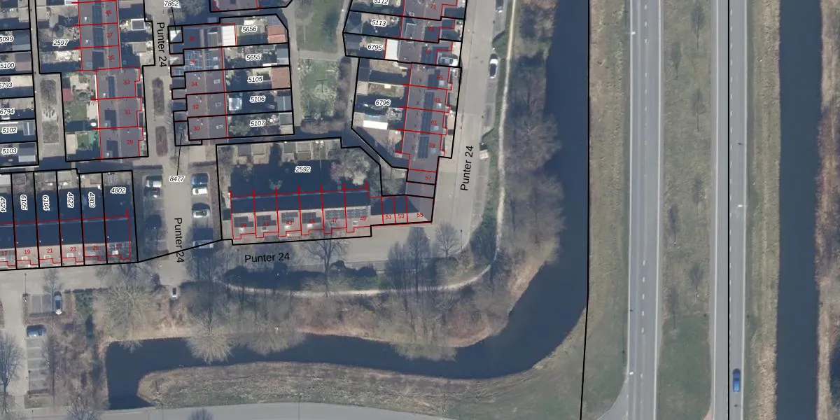 Het perceel waarop Punter 24 55 staat heeft een oppervlakte van 959 m². Dit is een groot perceel. De perceeloppervlakte wordt geregistreerd door het Kadaster. Gedetailleerde informatie over de maten van dit perceel kunt u vinden in het rapport Kadastrale kaart met maatvoering van Punter 24 55.