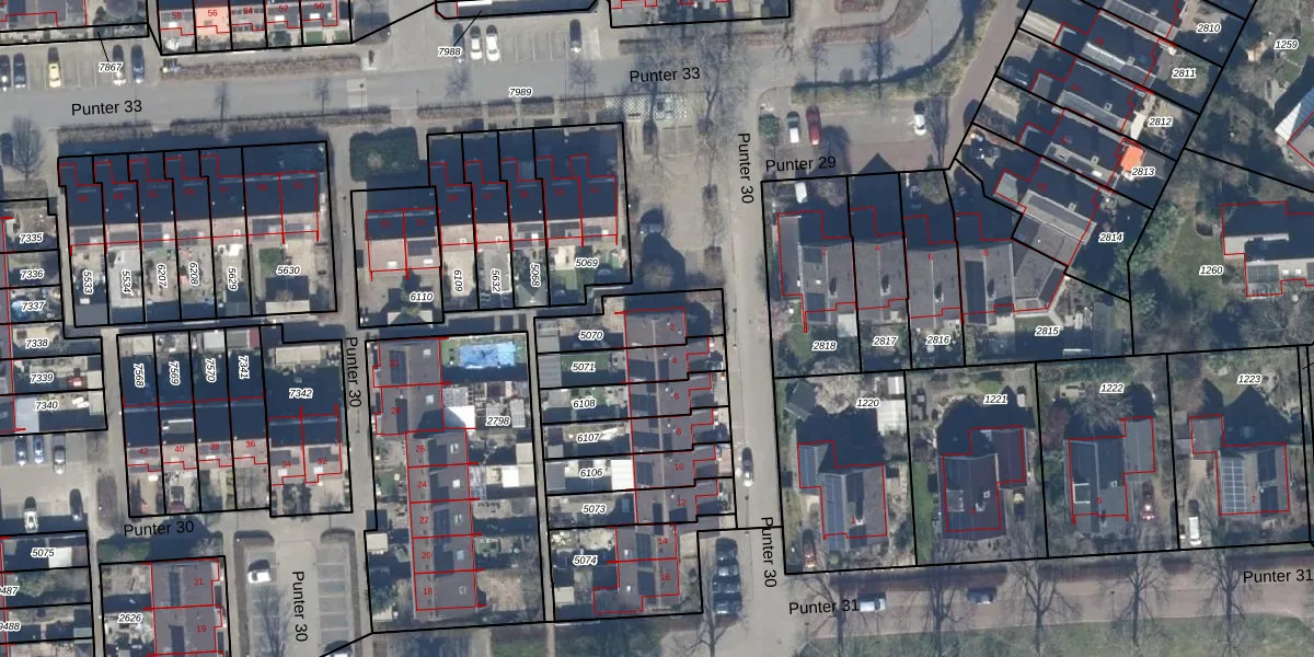 Het perceel waarop Punter 30 2 staat heeft een oppervlakte van 199 m². Dit is een middelgroot perceel. De perceeloppervlakte wordt geregistreerd door het Kadaster. Gedetailleerde informatie over de maten van dit perceel kunt u vinden in het rapport Kadastrale kaart met maatvoering van Punter 30 2.