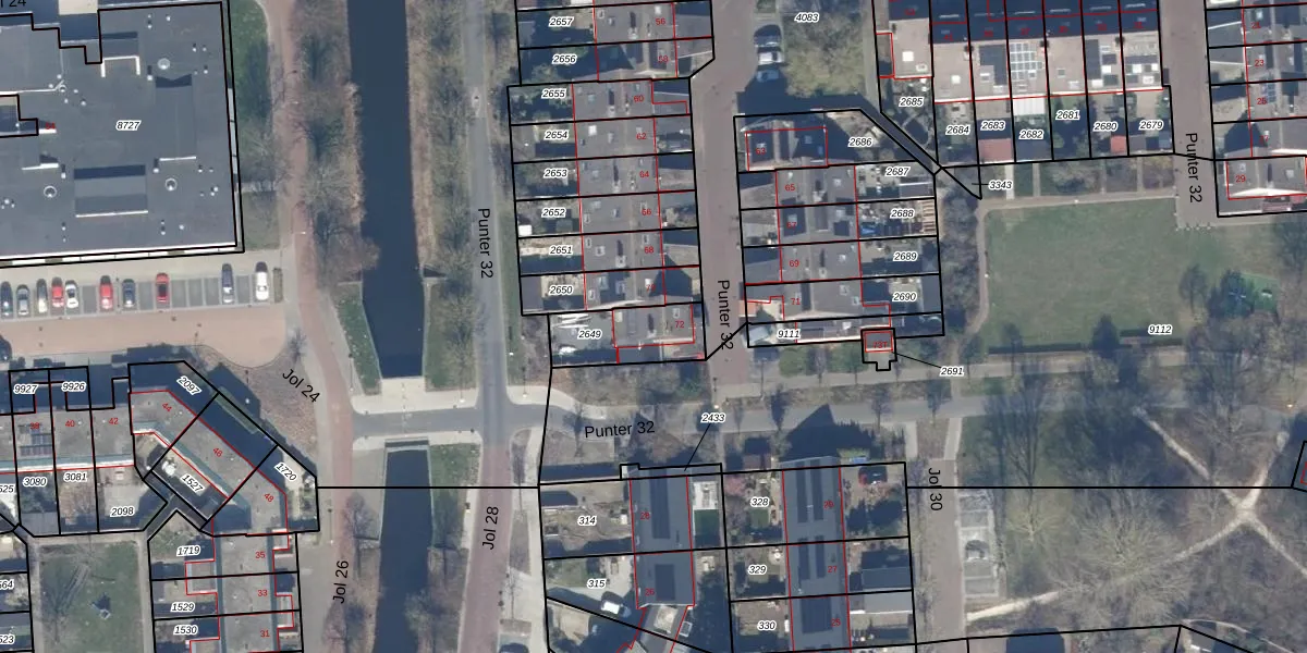 Punter 32 72 is gelegen op kadastraal perceel LLS00M2649. Deze kadastrale aanduiding is uniek en wordt gebruikt door het Kadaster om eigendomsrechten en andere zakelijke rechten vast te leggen. Het perceel maakt onderdeel uit van de kadastrale gemeente Lelystad.