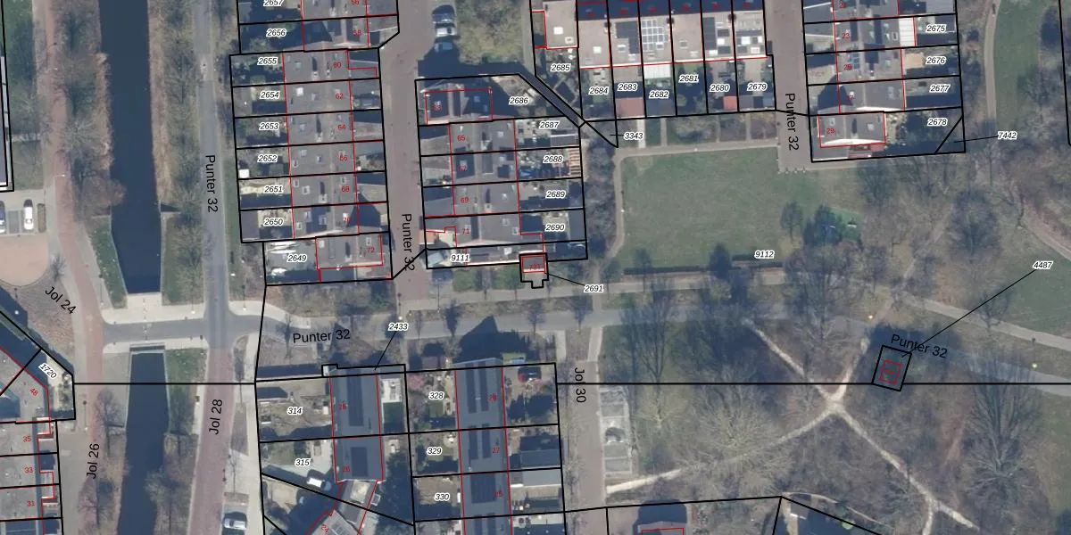 Punter 32 73-T is gelegen op kadastraal perceel LLS00M2691. Deze kadastrale aanduiding is uniek en wordt gebruikt door het Kadaster om eigendomsrechten en andere zakelijke rechten vast te leggen. Het perceel maakt onderdeel uit van de kadastrale gemeente Lelystad.