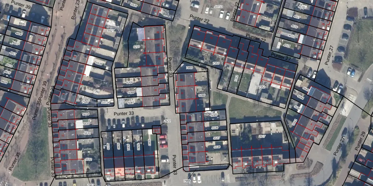 Het perceel waarop Punter 33 36 staat heeft een oppervlakte van 396 m². Dit is een groot perceel. De perceeloppervlakte wordt geregistreerd door het Kadaster. Gedetailleerde informatie over de maten van dit perceel kunt u vinden in het rapport Kadastrale kaart met maatvoering van Punter 33 36.