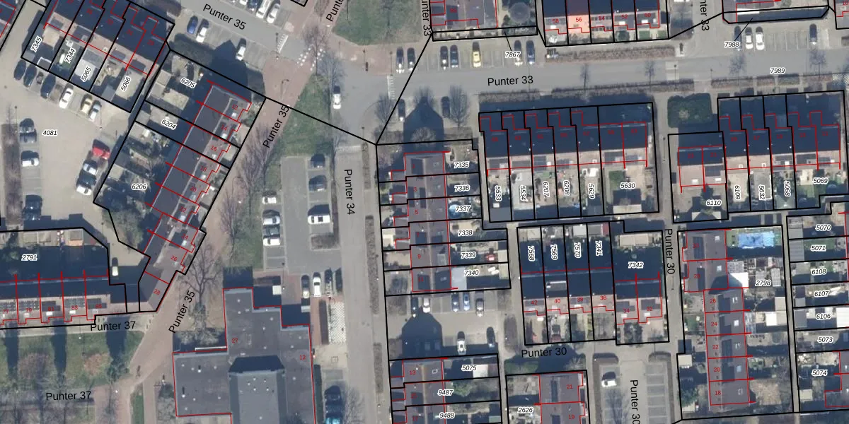 Punter 34 5 is gelegen op kadastraal perceel LLS00M7337. Deze kadastrale aanduiding is uniek en wordt gebruikt door het Kadaster om eigendomsrechten en andere zakelijke rechten vast te leggen. Het perceel maakt onderdeel uit van de kadastrale gemeente Lelystad.