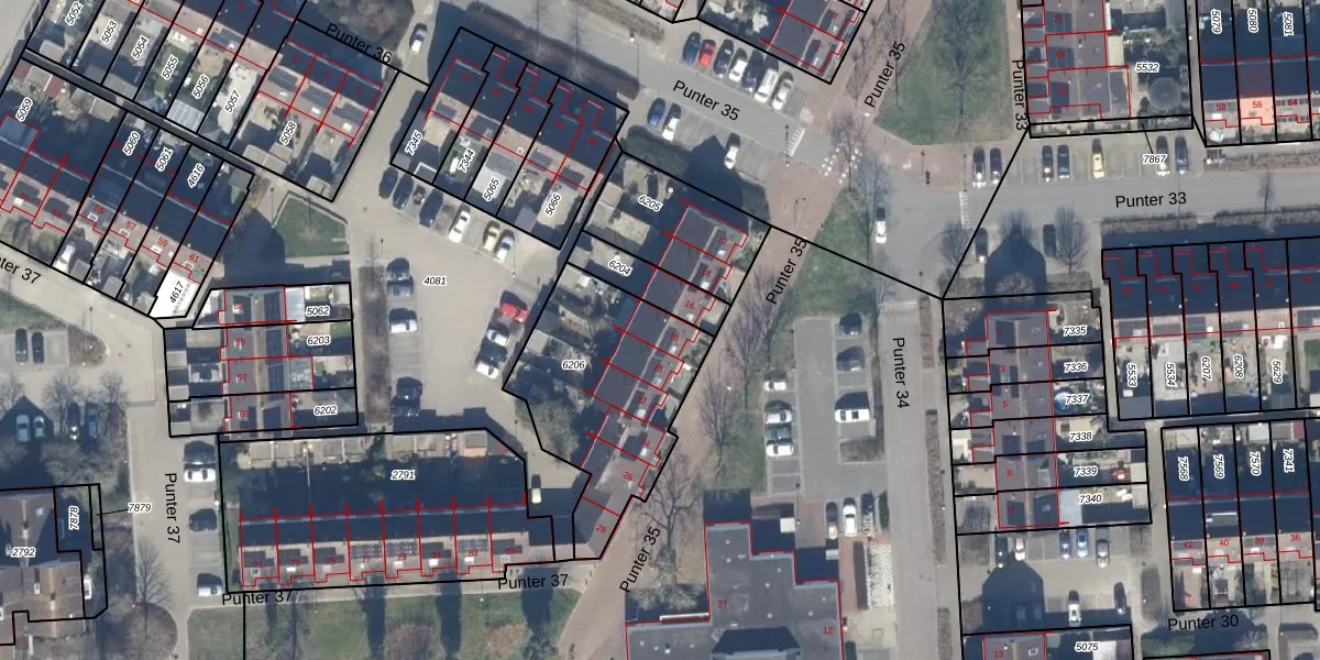 Het perceel waarop Punter 35 18 staat heeft een oppervlakte van 735 m². Dit is een groot perceel. De perceeloppervlakte wordt geregistreerd door het Kadaster. Gedetailleerde informatie over de maten van dit perceel kunt u vinden in het rapport Kadastrale kaart met maatvoering van Punter 35 18.