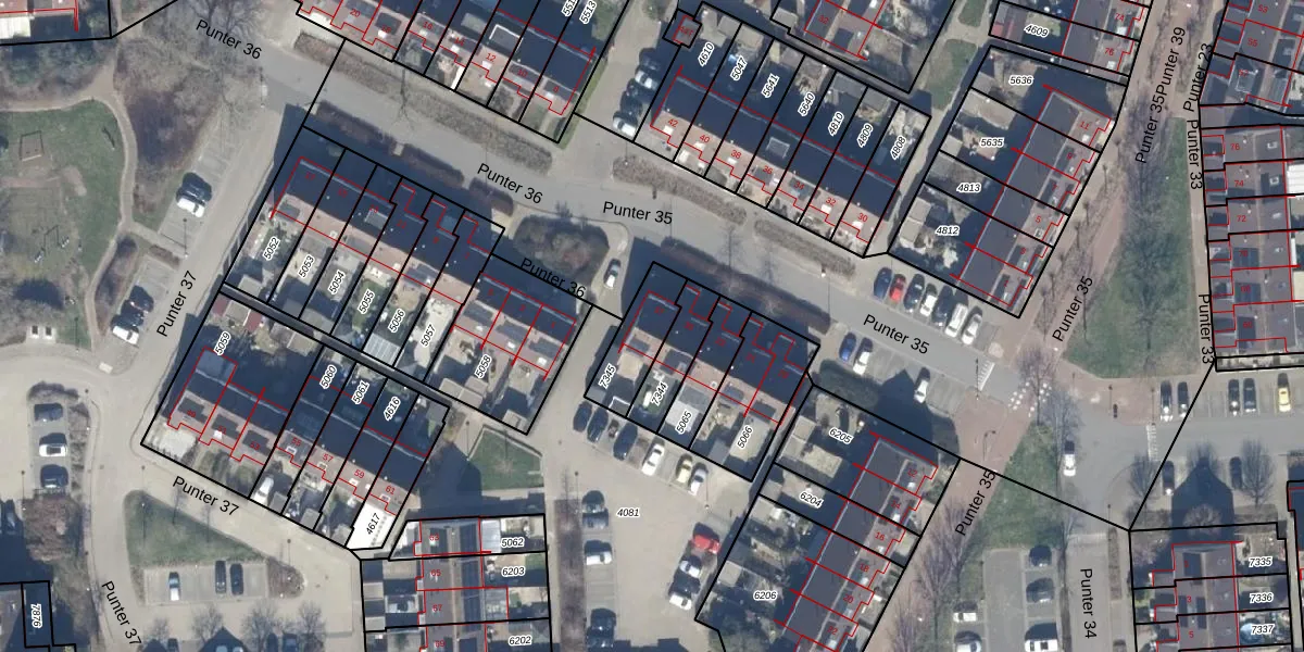 Het perceel waarop Punter 35 37 staat heeft een oppervlakte van 160 m². Dit is een middelgroot perceel. De perceeloppervlakte wordt geregistreerd door het Kadaster. Gedetailleerde informatie over de maten van dit perceel kunt u vinden in het rapport Kadastrale kaart met maatvoering van Punter 35 37.