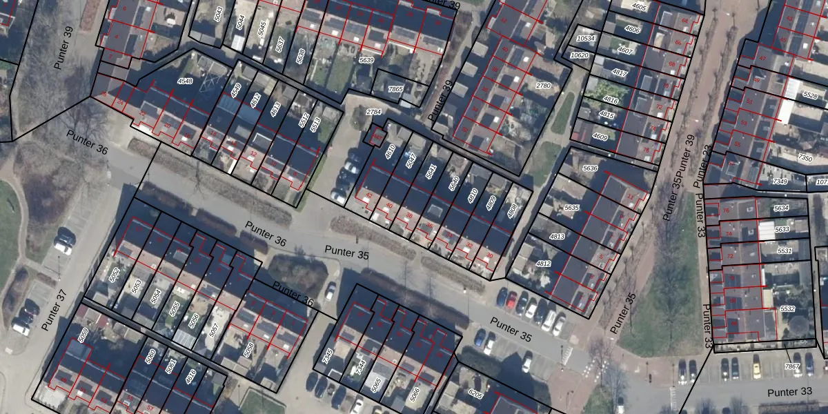 Het perceel waarop Punter 35 38 staat heeft een oppervlakte van 131 m². Dit is een middelgroot perceel. De perceeloppervlakte wordt geregistreerd door het Kadaster. Gedetailleerde informatie over de maten van dit perceel kunt u vinden in het rapport Kadastrale kaart met maatvoering van Punter 35 38.