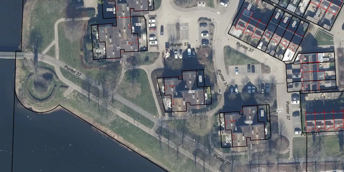 Het perceel waarop Punter 37 25 staat heeft een oppervlakte van 388 m². Dit is een groot perceel. De perceeloppervlakte wordt geregistreerd door het Kadaster. Gedetailleerde informatie over de maten van dit perceel kunt u vinden in het rapport Kadastrale kaart met maatvoering van Punter 37 25.