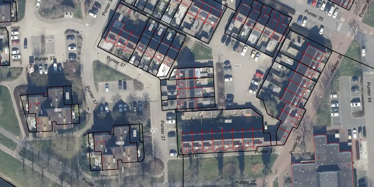 Punter 37 67 is gelegen op kadastraal perceel LLS00M6203. Deze kadastrale aanduiding is uniek en wordt gebruikt door het Kadaster om eigendomsrechten en andere zakelijke rechten vast te leggen. Het perceel maakt onderdeel uit van de kadastrale gemeente Lelystad.