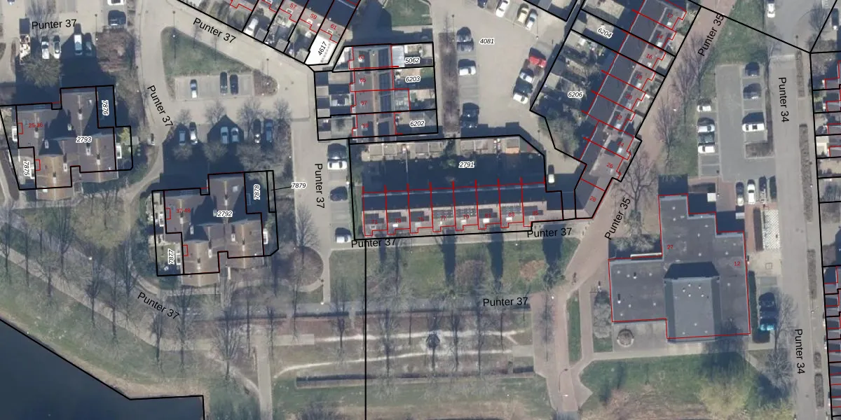 Punter 37 75 is gelegen op kadastraal perceel LLS00M2791. Deze kadastrale aanduiding is uniek en wordt gebruikt door het Kadaster om eigendomsrechten en andere zakelijke rechten vast te leggen. Het perceel maakt onderdeel uit van de kadastrale gemeente Lelystad.