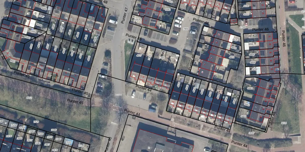 Het perceel waarop Punter 44 5 staat heeft een oppervlakte van 440 m². Dit is een groot perceel. De perceeloppervlakte wordt geregistreerd door het Kadaster. Gedetailleerde informatie over de maten van dit perceel kunt u vinden in het rapport Kadastrale kaart met maatvoering van Punter 44 5.