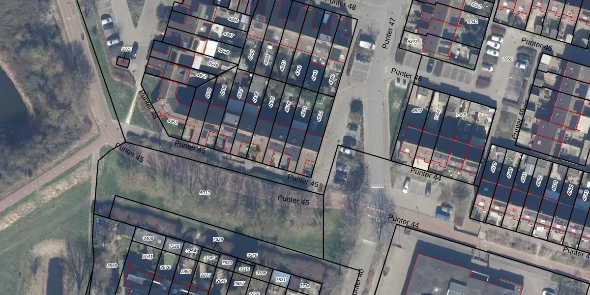 Punter 45 4 is gelegen op kadastraal perceel LLS00M4933. Deze kadastrale aanduiding is uniek en wordt gebruikt door het Kadaster om eigendomsrechten en andere zakelijke rechten vast te leggen. Het perceel maakt onderdeel uit van de kadastrale gemeente Lelystad.