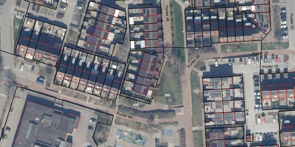 Het perceel waarop Punter 46 38 staat heeft een oppervlakte van 382 m². Dit is een groot perceel. De perceeloppervlakte wordt geregistreerd door het Kadaster. Gedetailleerde informatie over de maten van dit perceel kunt u vinden in het rapport Kadastrale kaart met maatvoering van Punter 46 38.