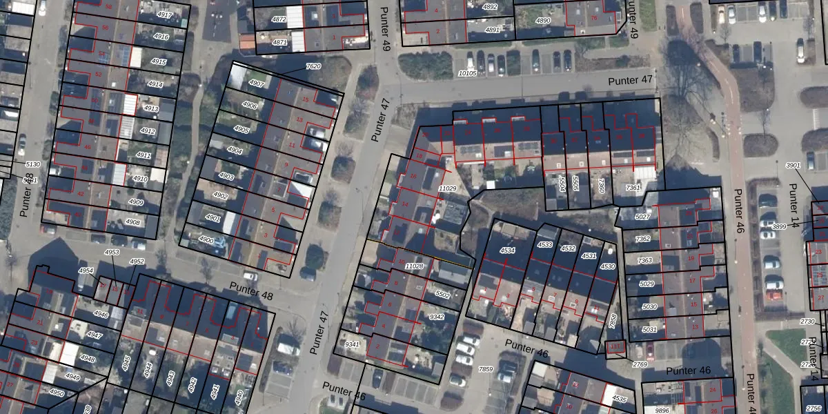 Het perceel waarop Punter 47 14 staat heeft een oppervlakte van 973 m². Dit is een groot perceel. De perceeloppervlakte wordt geregistreerd door het Kadaster. Gedetailleerde informatie over de maten van dit perceel kunt u vinden in het rapport Kadastrale kaart met maatvoering van Punter 47 14.