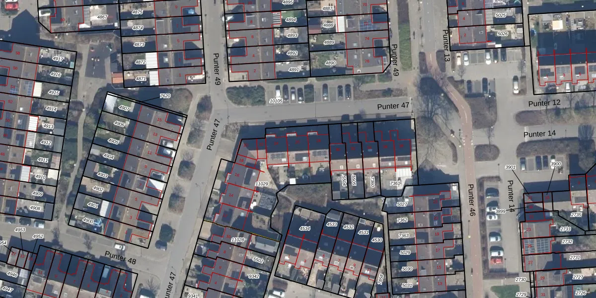 Het perceel waarop Punter 47 26 staat heeft een oppervlakte van 973 m². Dit is een groot perceel. De perceeloppervlakte wordt geregistreerd door het Kadaster. Gedetailleerde informatie over de maten van dit perceel kunt u vinden in het rapport Kadastrale kaart met maatvoering van Punter 47 26.