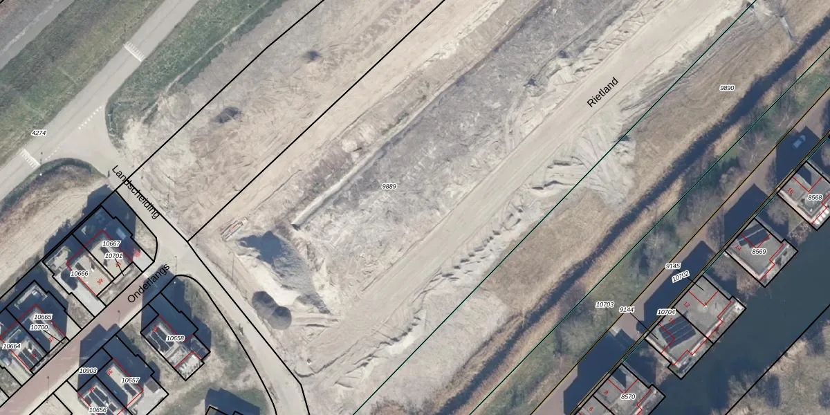 Het perceel waarop Rietland 5 staat heeft een oppervlakte van 1,9 ha. Dit is een zeer groot perceel. De perceeloppervlakte wordt geregistreerd door het Kadaster. Gedetailleerde informatie over de maten van dit perceel kunt u vinden in het rapport Kadastrale kaart met maatvoering van Rietland 5.