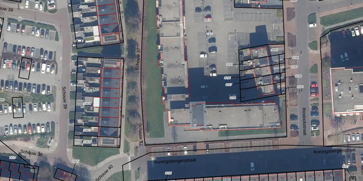 Het perceel waarop Rostockstraat 21 staat heeft een oppervlakte van 7630 m². Dit is een zeer groot perceel. De perceeloppervlakte wordt geregistreerd door het Kadaster. Gedetailleerde informatie over de maten van dit perceel kunt u vinden in het rapport Kadastrale kaart met maatvoering van Rostockstraat 21.