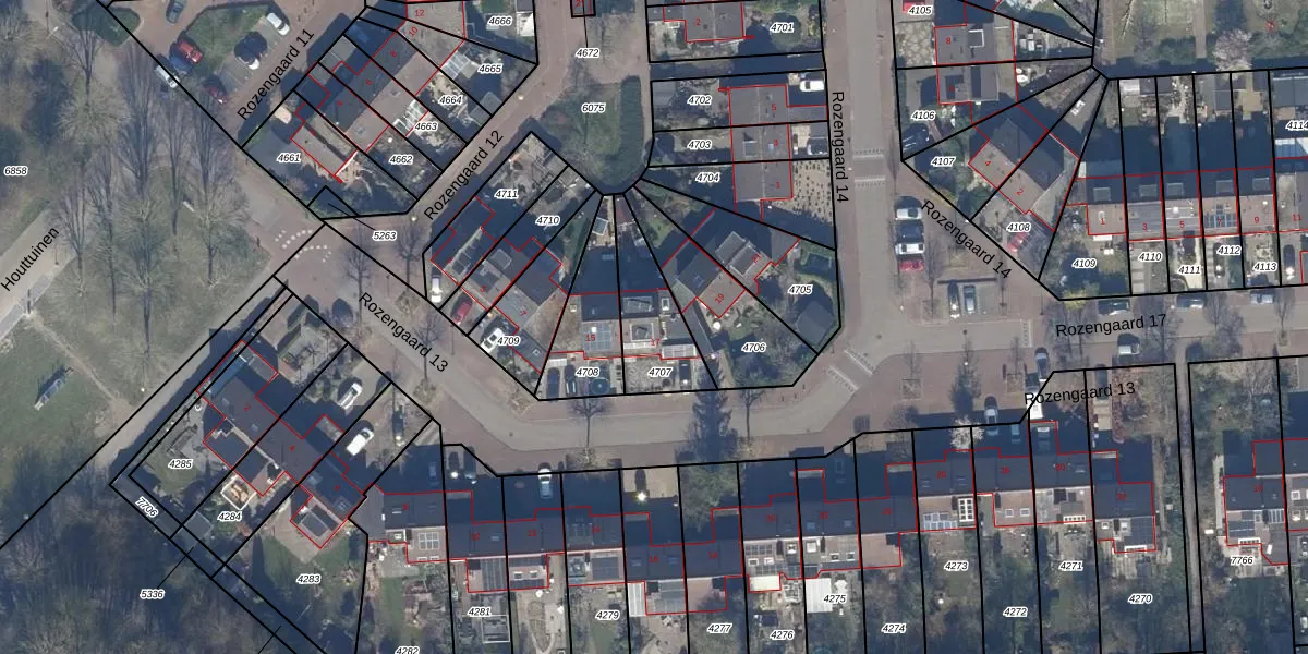 Rozengaard 13 17 is gelegen op kadastraal perceel LLS00K4707. Deze kadastrale aanduiding is uniek en wordt gebruikt door het Kadaster om eigendomsrechten en andere zakelijke rechten vast te leggen. Het perceel maakt onderdeel uit van de kadastrale gemeente Lelystad.